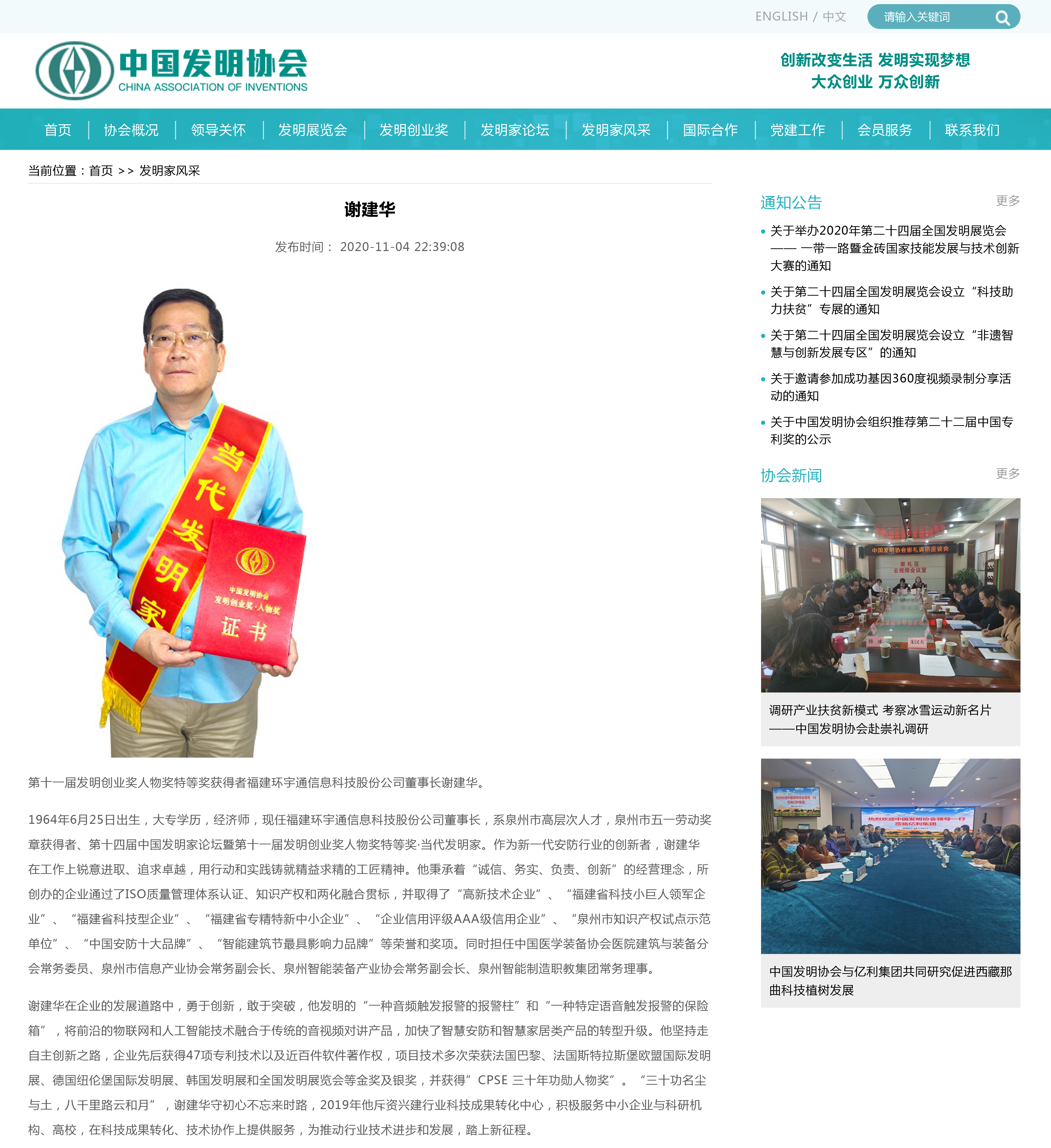 第十一屆發明創業獎人物獎特等獎獲得者福建環宇通信息科技股份公司董事長謝建華。 1964年6月25日出生,大專學歷,經濟師,現任福建環宇通信息科技股份公司董事長,系泉州市高層次人才,泉州市五一勞動獎章獲得者、第十四屆中國發明家論壇暨第十一屆發明創業獎人物獎特等獎·當代發明家。作為新一代安防行業的創新者,謝建華在工作上銳意進取、追求卓越,用行動和實踐鑄就精益求精的工匠精神。他秉承著“誠信、務實、負責、創新”的經營理念,所創辦的企業通過了ISO質量管理體系認證、知識產權和兩化融合貫標,并取得了“高新技術企業”、“福建省科技小巨人領軍企業”、“福建省科技型企業”、“福建省專精特新中小企業”、“企業信用評級AAA級信用企業”、“泉州市知識產權試點示范單位”、“中國安防十大品牌”、“智能建筑節最具影響力品牌”等榮譽和獎項。同時擔任中國醫學裝備協會醫院建筑與裝備分會常務委員、泉州市信息產業協會常務副會長、泉州智能裝備產業協會常務副會長、泉州智能制造職教集團常務理事。
